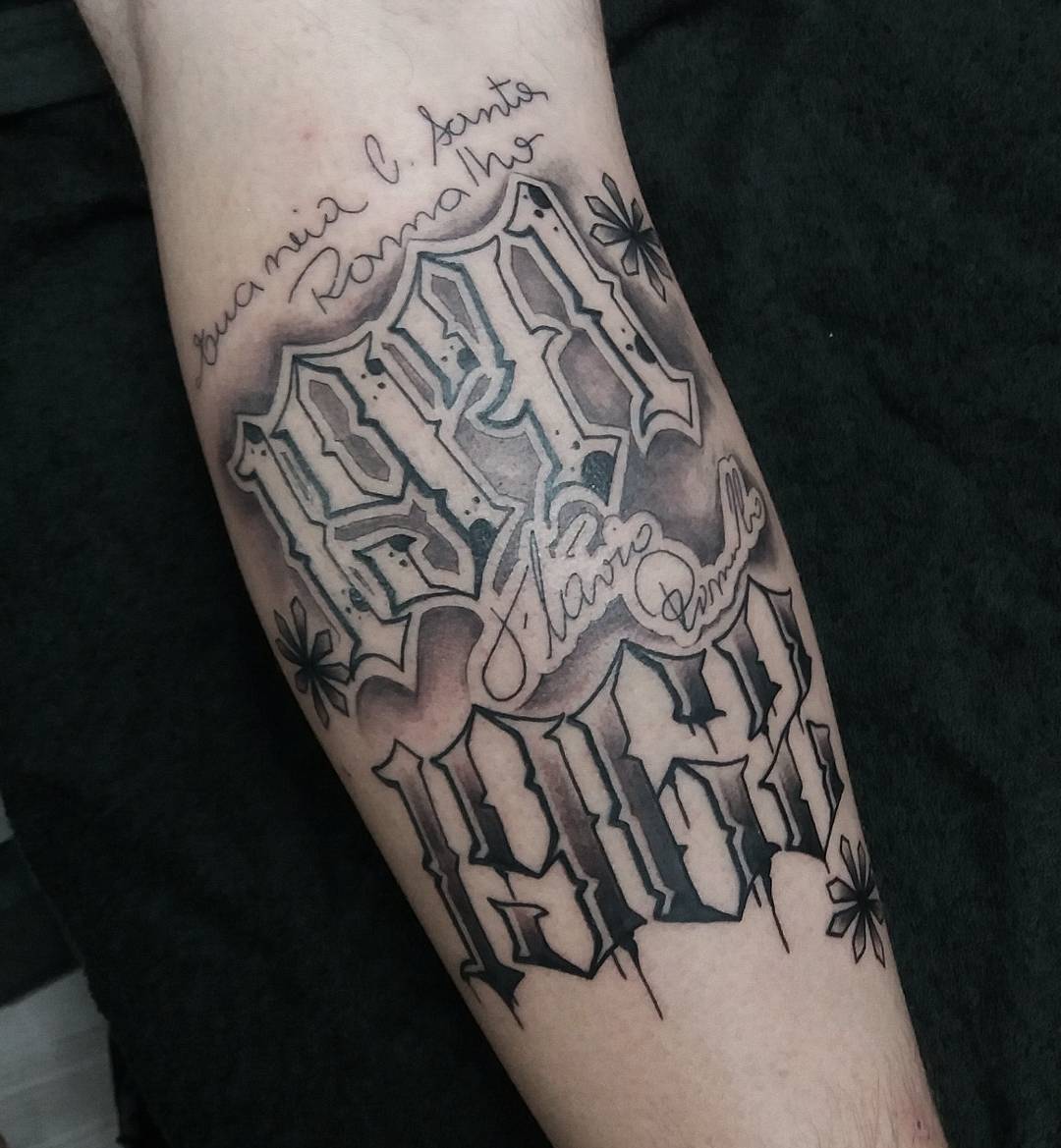 西安东方绿洲做促销员的焦先生小臂奇卡诺花体字纹身图案